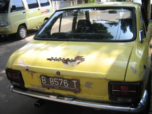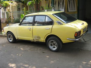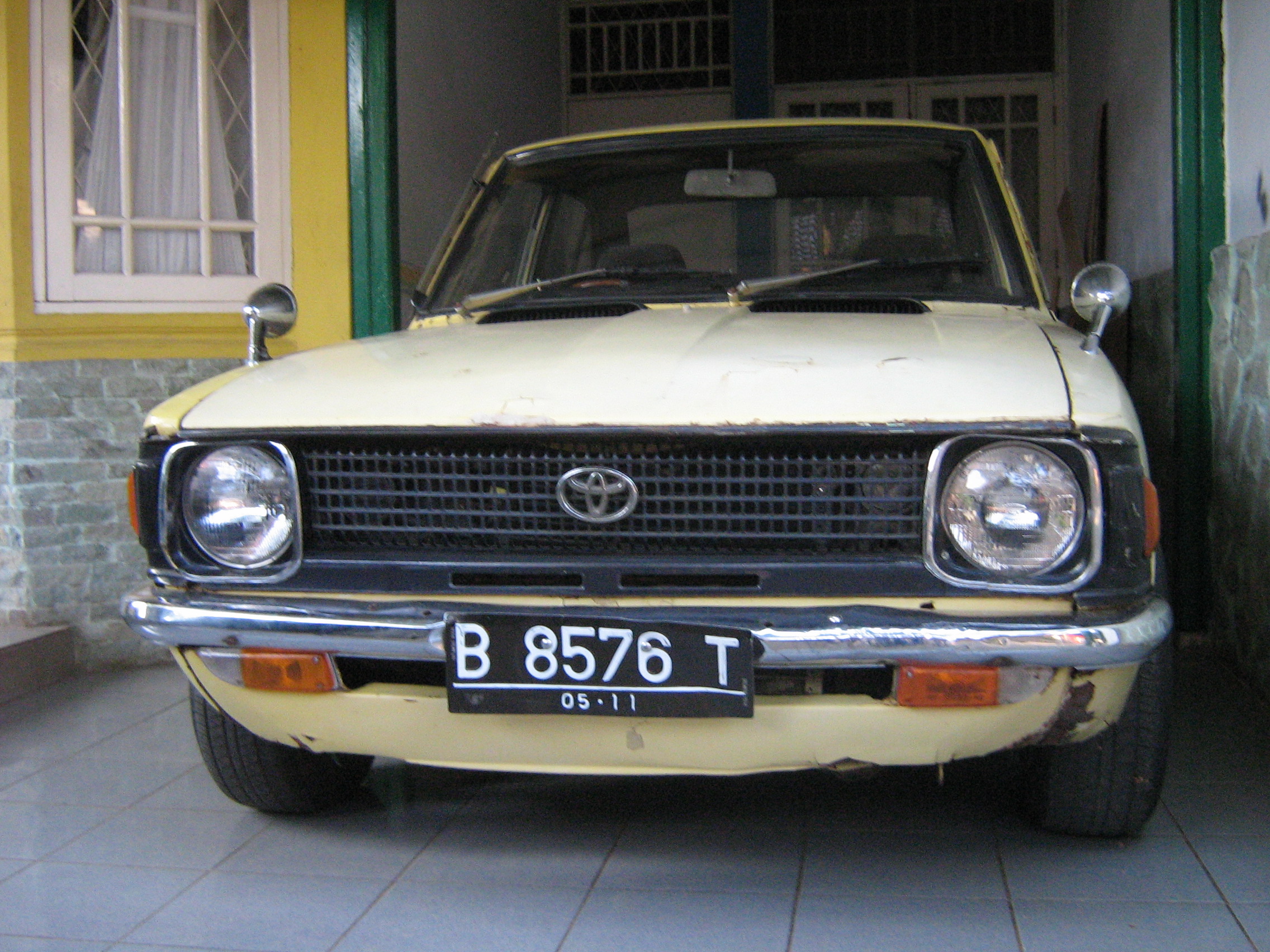 corolla tua..kuning pucat..penuh karat…cat ngelupas..dempul tebal pada beberapa bagian..kubawa dari daerah sentiong ke jatibening…yg punya firman namanya…masih pegang katalog parts nya lho…inilah dia ..Corolla KE-20 thn 70…