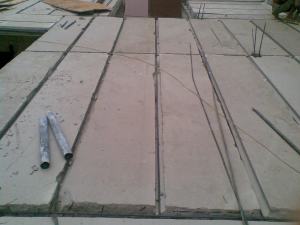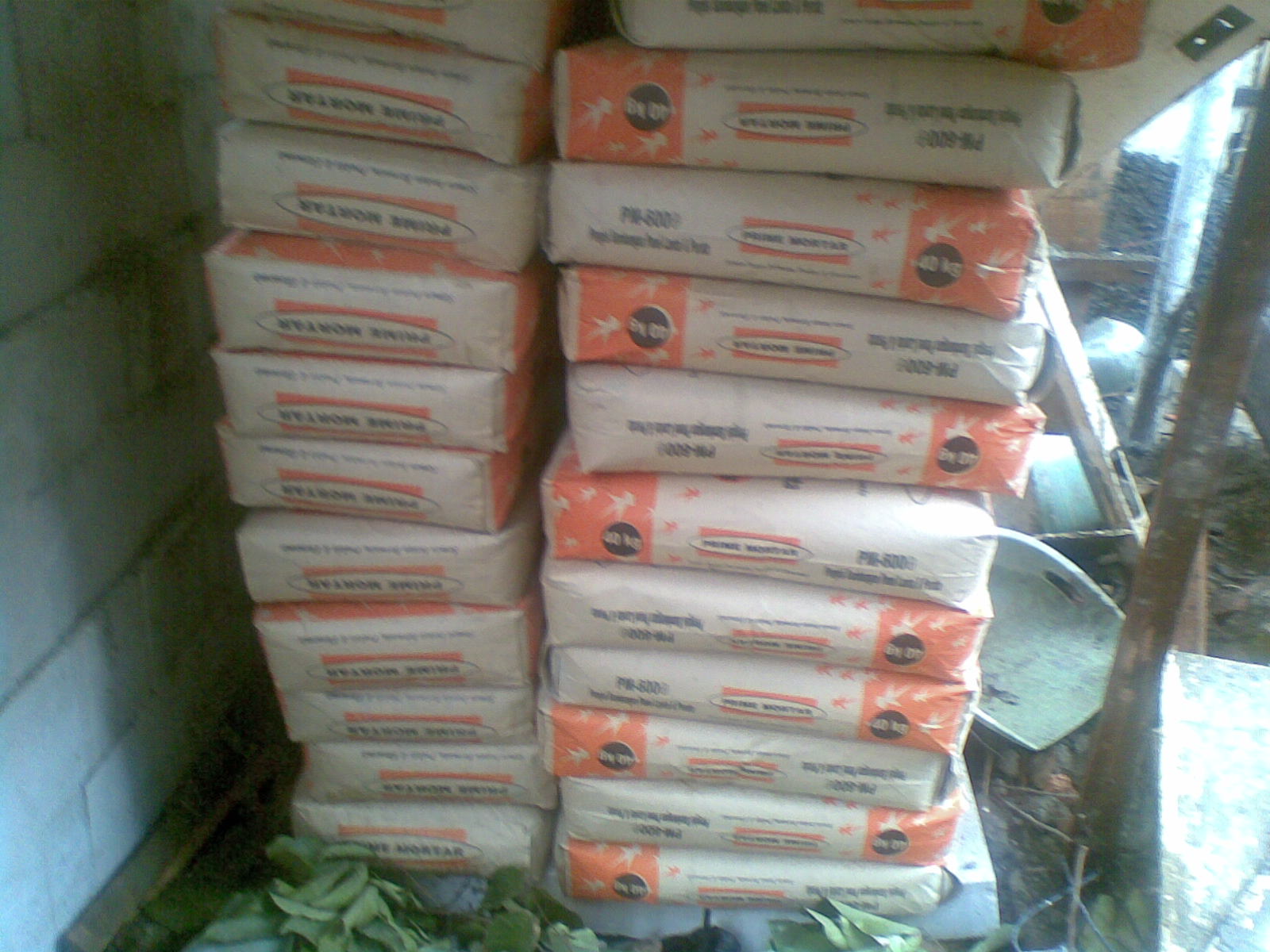 tadinya bingung juga bagaimana caranya supaya panel itu tidak bergerak. baca diweb katanya sih diikat dengan cor dengan besi satu batang..gimana persisnya pengin juga liat. Bener juga, pas joko n team dateng mereka sudah bawa besi 12..lonjoran..sama pm600 nya Mortar..itu semen instant untuk meratakan lantai..kira2 mirip dengan adukan untuk plesteran kali ya…plus ada juga thin bed nya mortar..lupa nomor berapa..untuk menambal panel yang sompal. nah kalo liat di gambar ada garis-garis itu lubah antar panel..jadi setiap sisi panel ada alur seperti selokan kecil..5 cm..nanti bertemu dengan alur yg sama dari panel yg lain..jadi deh ada selokan antar panel baik sisi panjang maupun pendeknya…nah di sini lah ditaru besi beton itu..sebatang saja..diikat disetiap pertemuannya…alur ini kemudian dicor istilah mereka..tapi sebenarnya diisi dengan pm60..lalu diratakan..Termasuk juga sisi ujung panel yang ada diujung balok…dipasang triplek tebal dibalok cor kita..lalu diisi juga dengan pm600 supaya rapih dan siku. ini dia tumpukan pm600 nya.