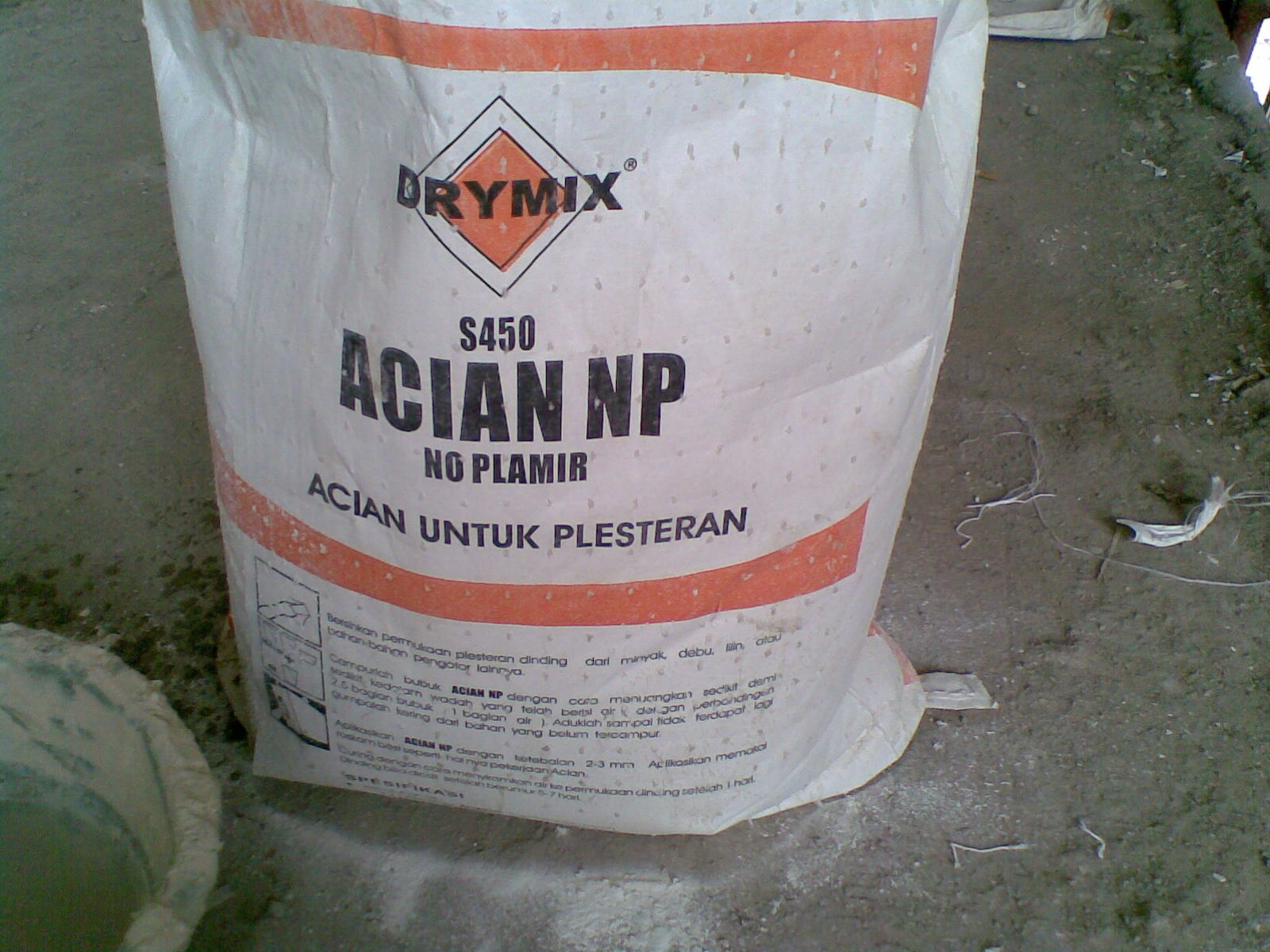 Mortar acian lebih lama kering..jadi tukang lebih santai..lebih empuk. hasilnya bisa sama halusnya…gw beli acian yang tidak perlu diplamur lagi..warnyanya sudah putih..eh krem deh…jadi dijamin gak perlu lagi step tambahan..abis aci..tunggu seminggu langsung cat warna. kebetulan drymix lagi sale..diskon 20% kalo gak salah. ya sudah, hitung aja total hebel yagn dipake dulu 35 kubik alias 350 meter persegi.kalo bolak balik diplester aci. berarti ada 700 meter persegi. kalo satu zak 40 kilo bisa nutup 10-12 meter, berarti butuh 70 zak. untuk amannya beli aja dulu 60 zak deh..per zak harganya 51 ribu..sekarang sih sudah balik lagi ke 62 ribu. Ada juga yg sebut acian ini skimcoat..jadi acian putih langsung..gak perlu plamir dan tidak retak rambut.