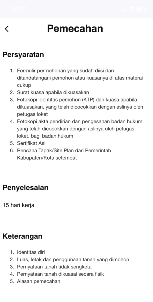 Prosesnya ada dua tahap. Pertama adalah pengukuran, kedua pemecahan itu sendiri. Di aplikasi, setelah info layanan kita pilih lewat menu search aja…pengukuran. dari sini pilih jenis pengukuran, pengembalian batas . Biayanya kita bisa simulasikan langsung dari situ juga. Gue sih waktu itu bayar sekitar 300 ribuan dan pakai kartu debit bisa. Pembayaran waktu dokumen kita semua dinyatakan lengkap.
