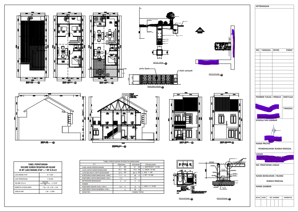 Gambar situasi ini jadi rada penting karena ada rencana pagar disana, ada resapan air, hitung2an lain yang musti dibikin dalam bentuk tabel. Koreksi gw bolak balik ya dibagian ini, karena arsitek gw dari tokped ini ternyata blum paham gimana Gambar Situasi nya yg biasa di DKI Jakarta.