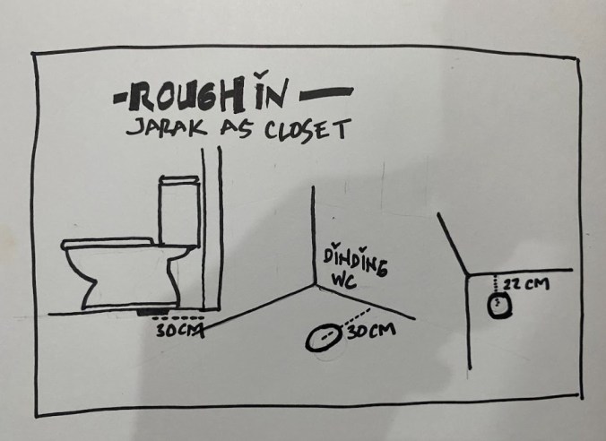 Di WC nya sendiri ujung pipa ini perlu ditentukan di titik mana dan berapa jaraknya dari tembok. Jarak lubang Closet dengan tembok ini yang kalo tukang sebut jarak As dari tembok. Ini menggambarkan berapa jauh lubang closet yang disiapkan jaraknya dari tembok/dinding. Jarak ini harus sama dengan rough in atau jarak as dari Closet yang kita beli. Harus sama !